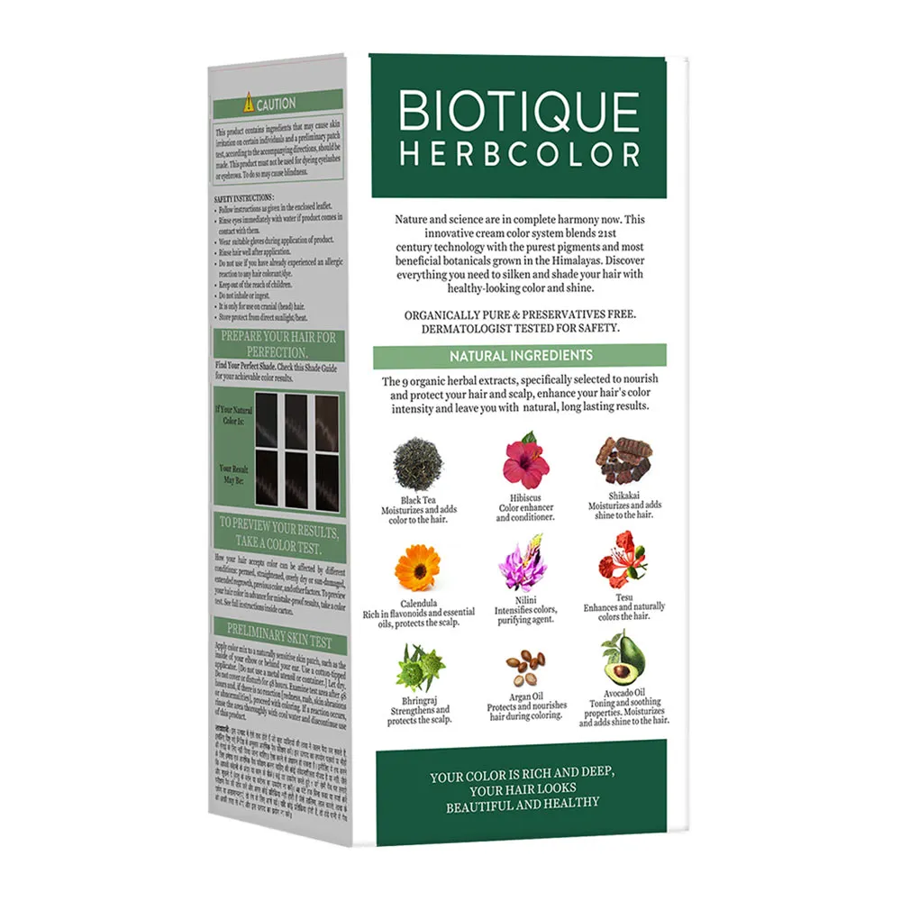 Biotique personifies the ultimate in Indian traditional medicine, advanced by cutting edge Swiss biotechnology – a beauty legacy built on product purity, sustainability, universality, pioneering research, development and manufacturing for over 25 years. Biotique products are made of 100% organically-pure, preservative-free ingredients and renewable resources- cultivated, gathered, blended and manufactured in the foothills of the Himalayas. Biotique with its roots in organic bases and active botanicals – has now launched Herb Color. For the first time in India- Hair Color which is completely Natural, infused with 9 organic herbal extracts. Nature and science are in complete harmony now. This innovative cream color system blends 21st-century technology with the purest pigments and most beneficial botanicals grown in the Himalayas. Discover everything you need to silken and shade your hair with healthy-looking color and shine.