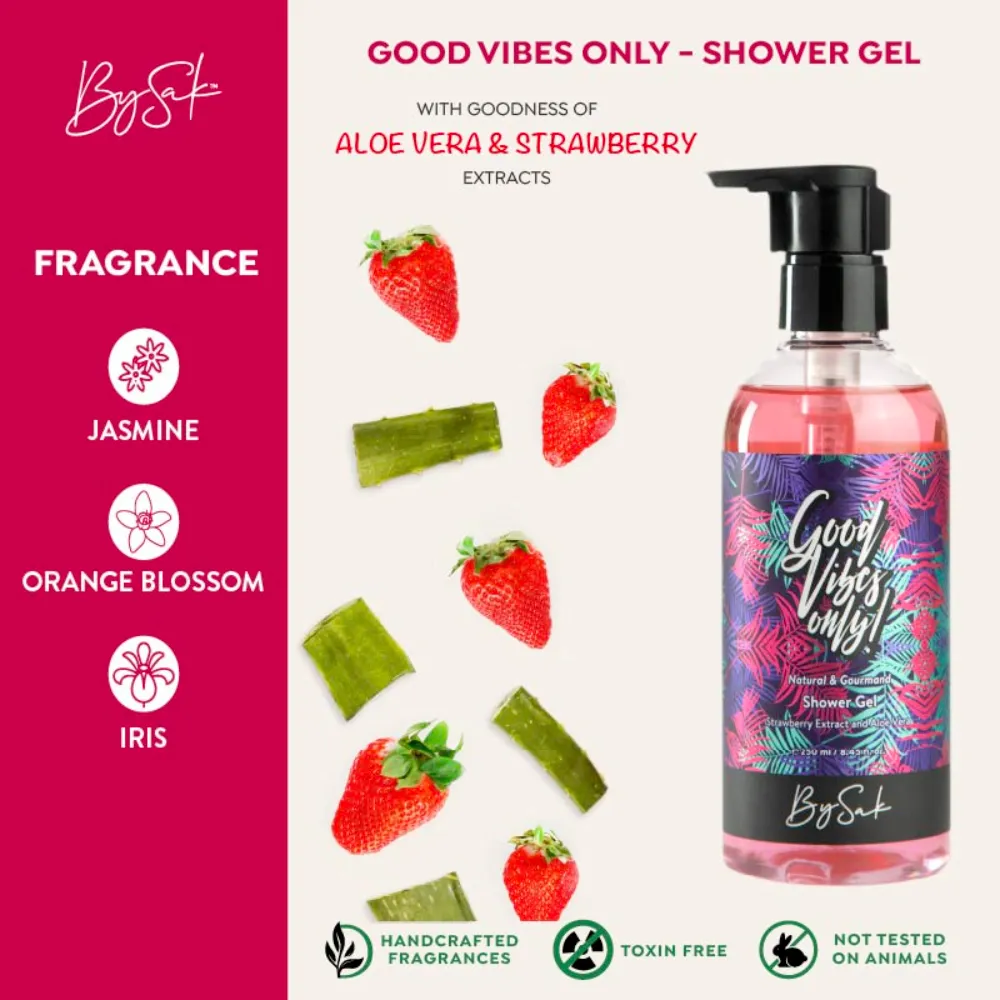 Sparkling and beautiful, the BySak Good Vibes Only Shower Gel is infused with strawberry extracts and aloe vera. This gentle and non-drying shower gel blended with a sweet fruity aroma is the perfect way to make your shower a surprisingly delicious experience.