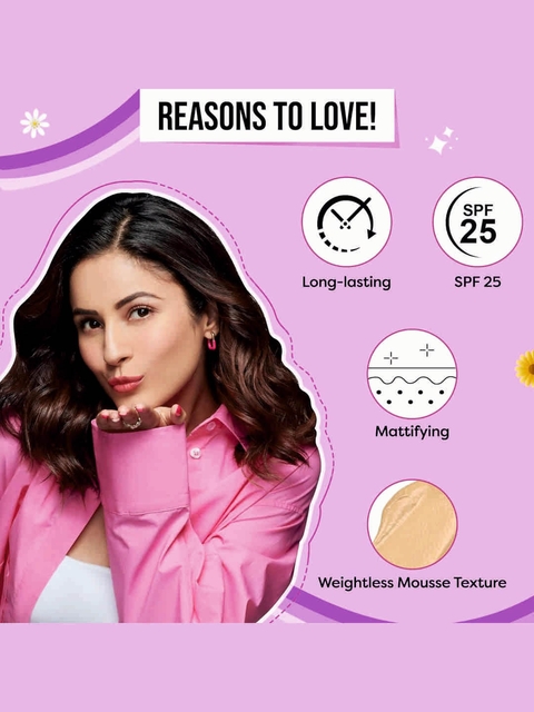 | Special Features | Now, double up on your skincare and makeup in one go with our Daily Wear Foundation that's powered with SPF 25. , Specially formulated with an airy mousse texture, this lightweight yet buildable foundation glides easily onto your skin and won't crease or settle in your fine lines.Super long-wearing and highly pigmented, this weightless mousse formula instantly blurs pores, evens out skin tone and controls shine for a flawless smooth complexion.The formula gives a matte finish that lasts up to 8-hours and protects your skin from harmful UV rays thanks to the added SPF 25.Creamy but never greasy, this one works for all skin types.Weightless mousse textureFormulated with SPF 25Prevents sun damageMattifies skinControls shineBuildable coverage Blends easilyGives a seamless finishLasts up to 8 hours |
