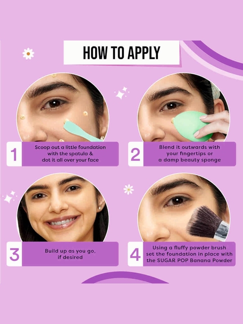 | How-to-Apply | Scoop out a little foundation with the spatulaDot it all over your faceBlend it outwards with your fingertips or a damp beauty spongeBuild up as you go, if desiredUsing a fluffy powder brush set the foundation in place with the SUGAR POP Banana Powder |