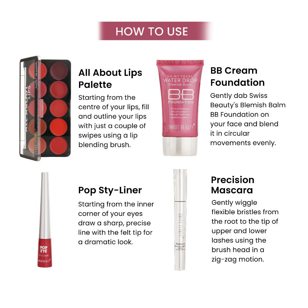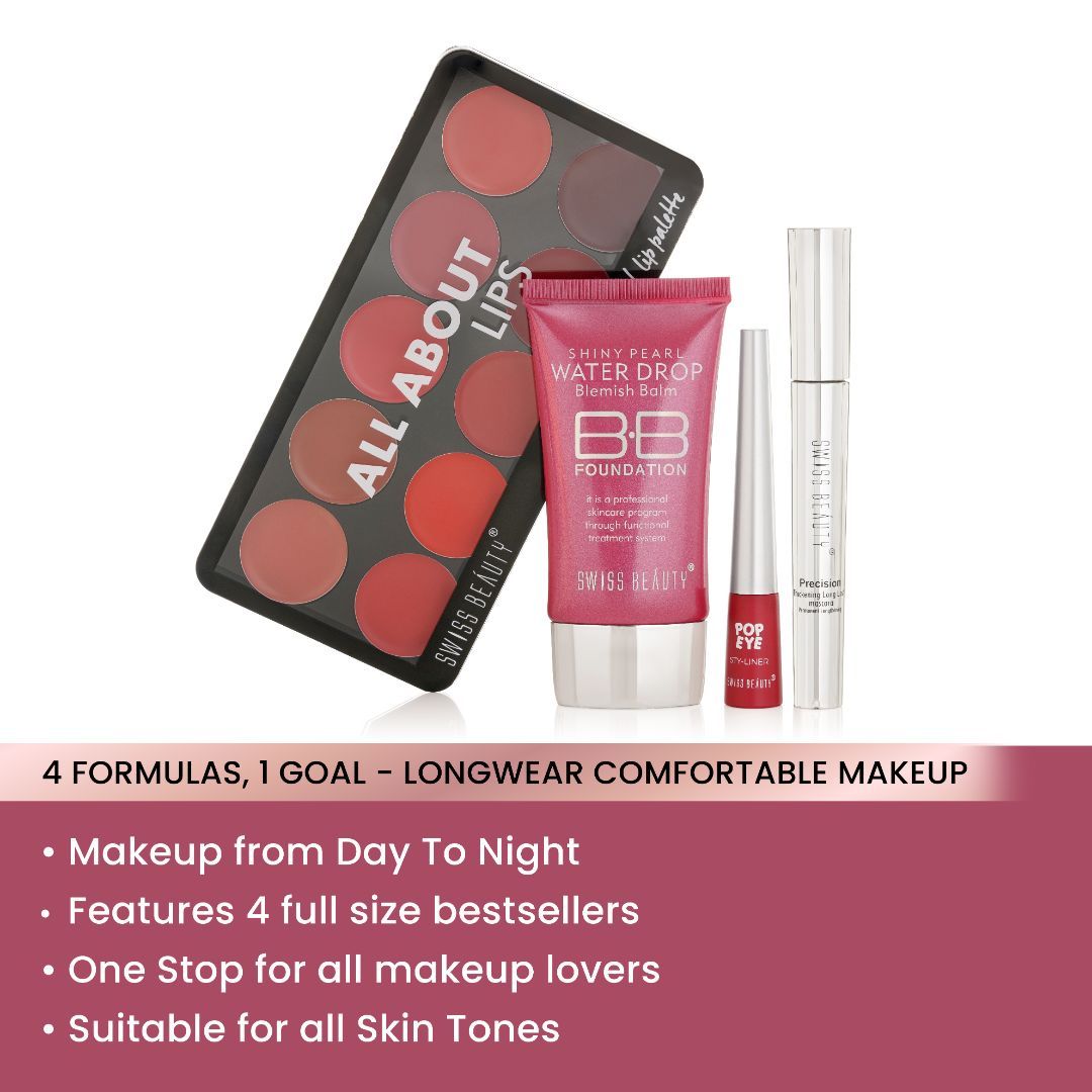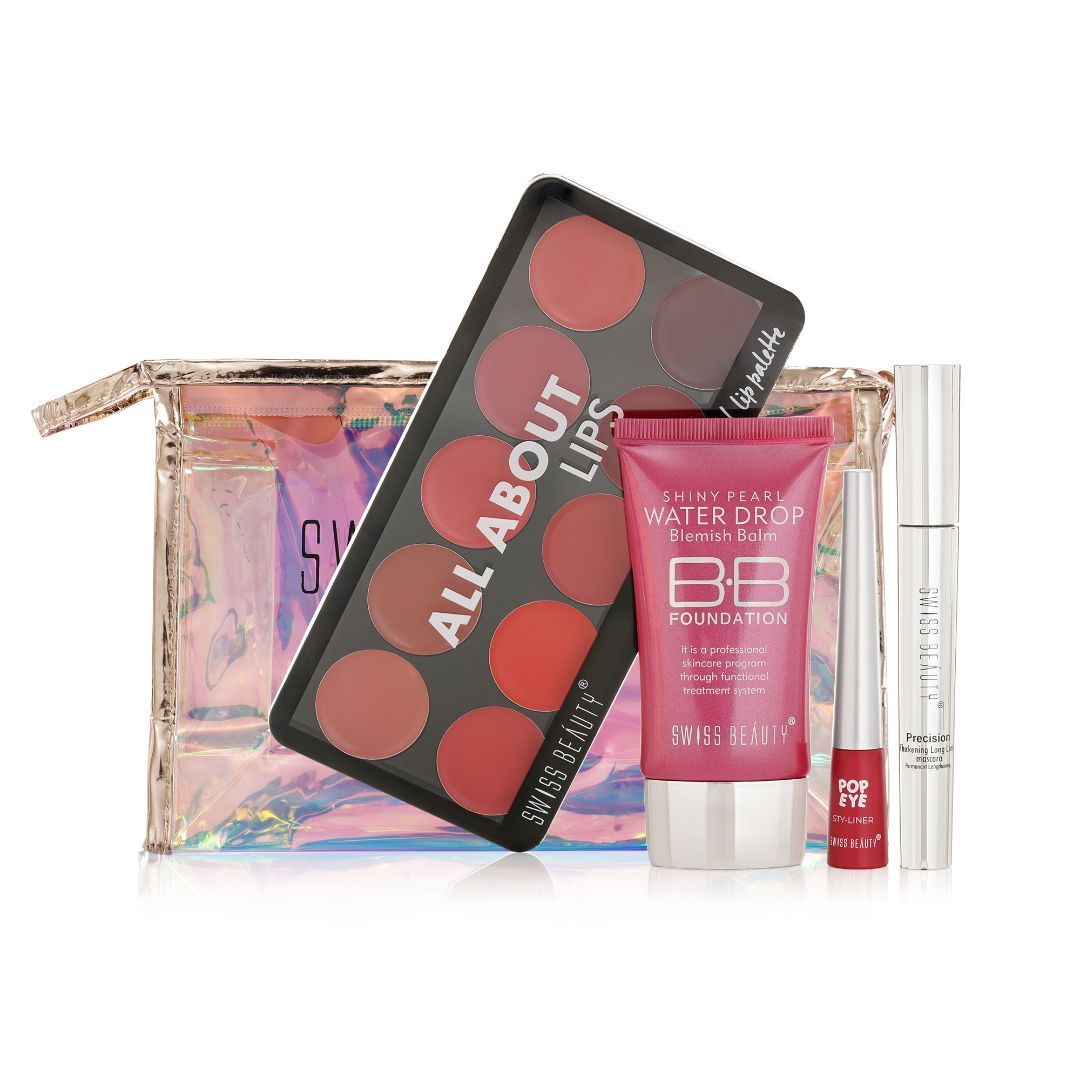 An all in one makeup kit set featuring 4 full size makeup essentials to light up your face, eye and lip along with a cute rainbow pouch to stash in your favourites. Get prepped to Swipe Your Love this Valentine’s with your perfect day to night look with Swiss Beauty’s First Love Day-Night Kit. Inside The Kit: Blemish Balm BB Foundation: Non-greasy formulation that provides an SPF 15 protection, covers dark spots and acts as the perfect ‘second skin’ for a daily ‘no makeup, makeup’ look. This long-lasting hydrating formula has a luminous silky texture that gives buildable coverage from low to medium for a perfect crease-free makeup. All About Lips Palette: A 10-in-1 Lip Palette available in 3 different shades featuring highly covetable, richly pigmented lip shades. It’s creamy to matte, highly blendable formulation efffortlessly glides on the lips whilst feeling weightless that lasts all day long. Pop Sty-liner: Available in 8 different shades, Swiss Beauty’s Pop Sty-Liner is your go-to for adding that pop flush of colour on your eyelids. Smudgeproof and deeply pigmented, Swiss Beauty’s Pop Sty-liner lasts all day long whilst being water resistant in nature Precision Mascara: The thick black pigment lifts, conditions, softens each lash without making it crunchy or stiff and helps it reach its full potential. Swiss Beauty Waterproof Volume Mascara is safe for sensitive and contact lens wearers. Result? Big Time Big Lashes.
